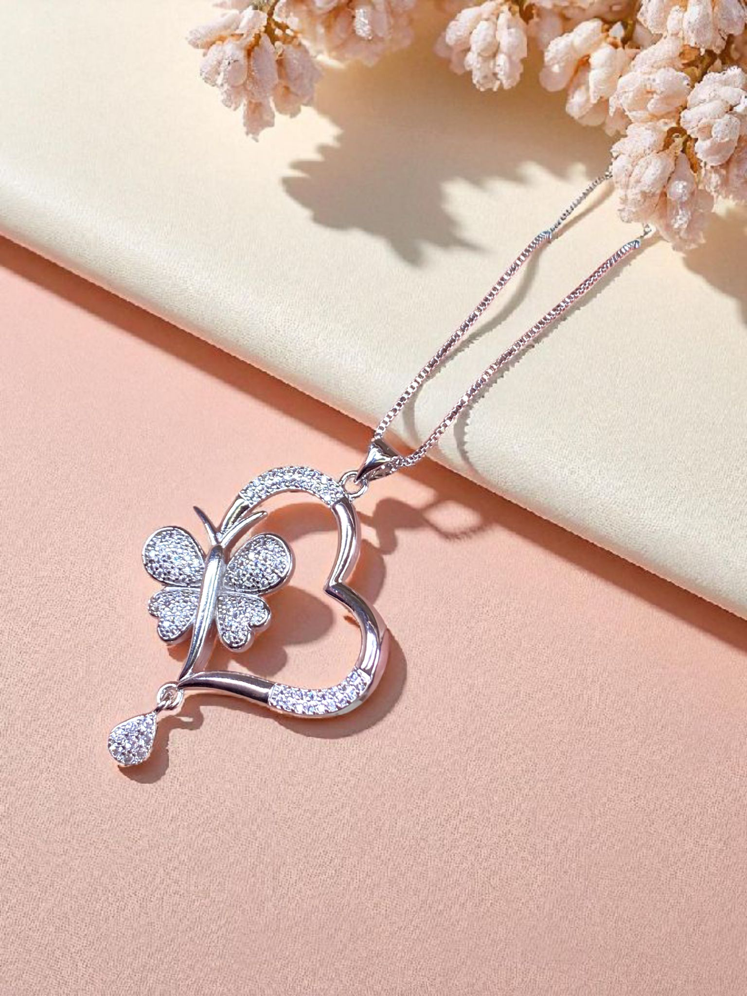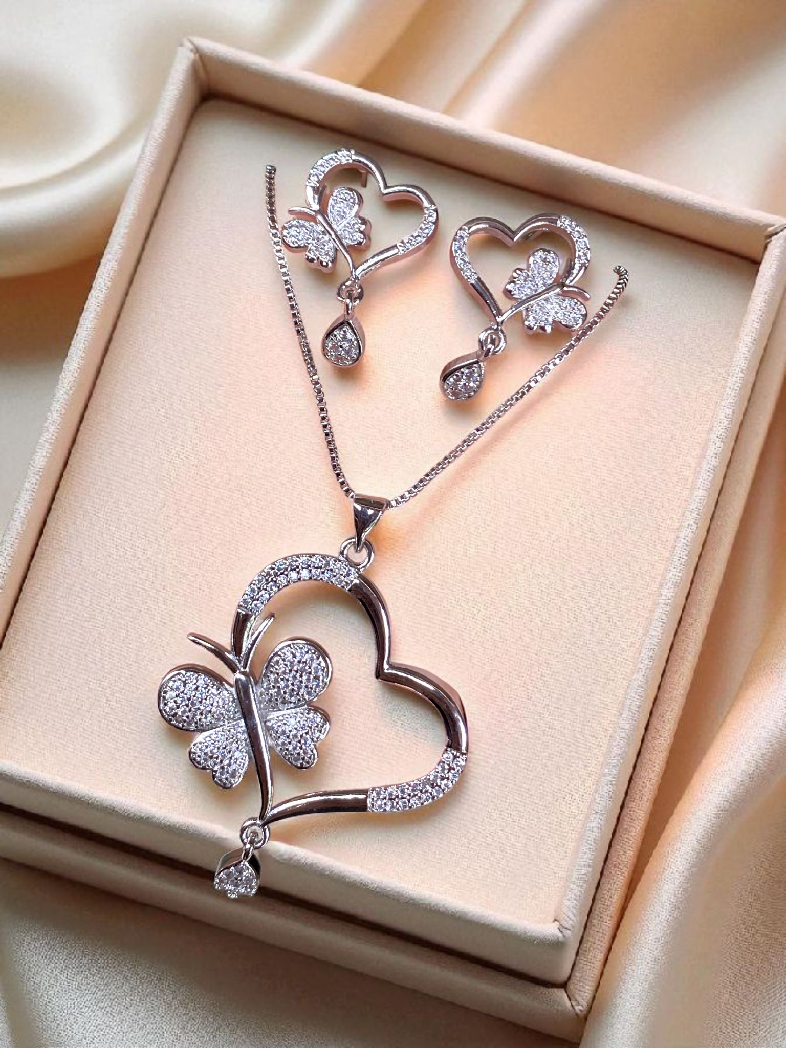 Embrace elegance with this intricately designed butterfly and heart-shaped pendant set, Adorned with shimmering stones that catch the light beautifully, the set includes a matching pair of earrings and a pendant suspended from a fine chain.