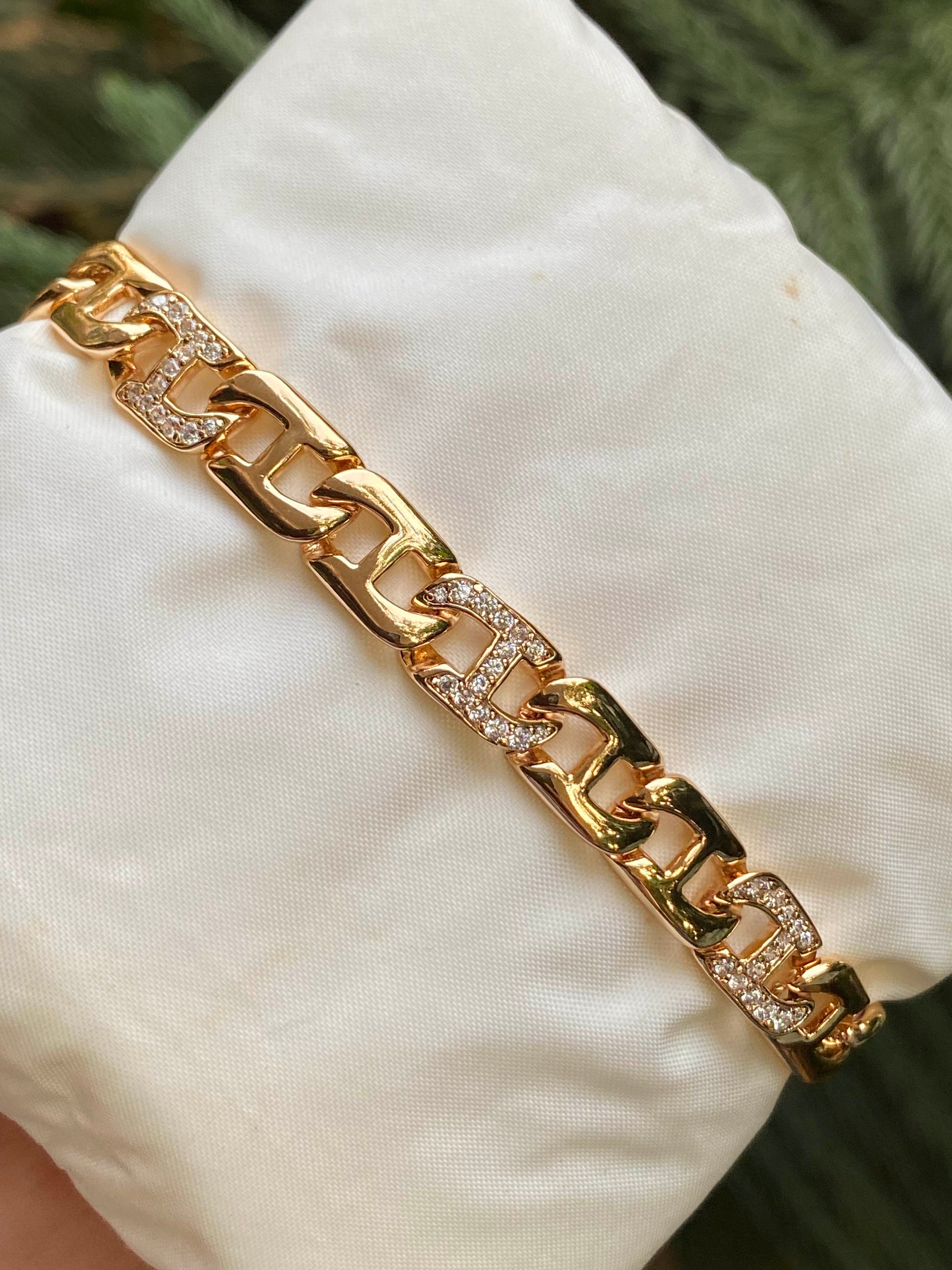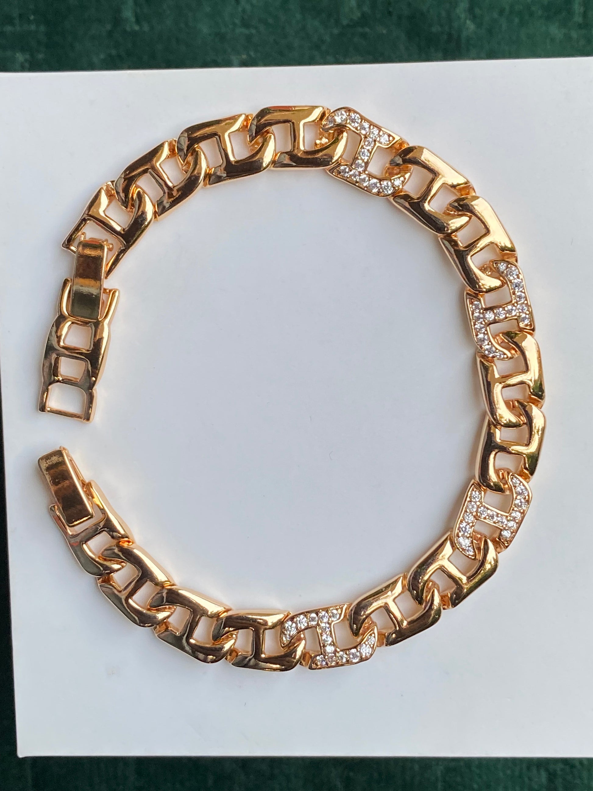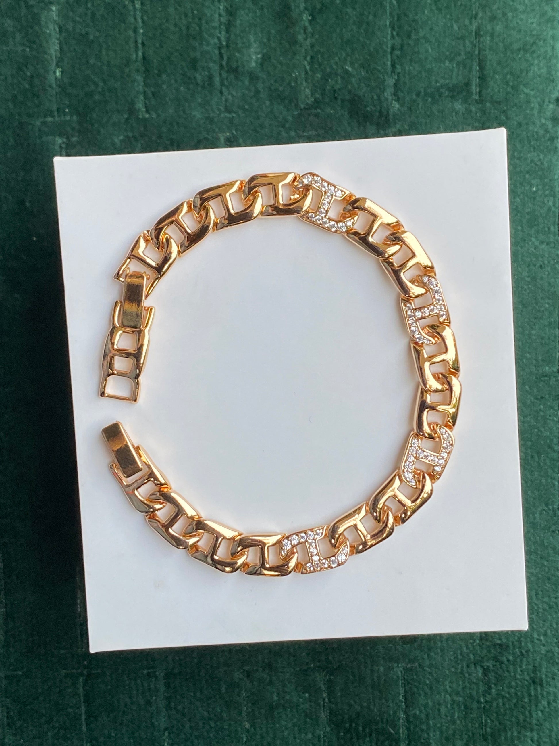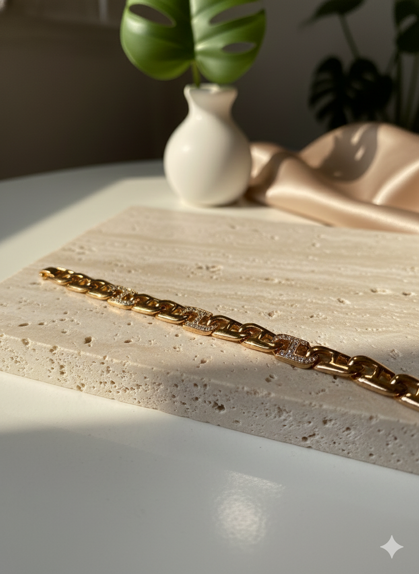 A bold gold chain bracelet with iced-out links that hit instantly. Clean shine, chunky vibe, and just the right amount of sparkle to elevate any fit.