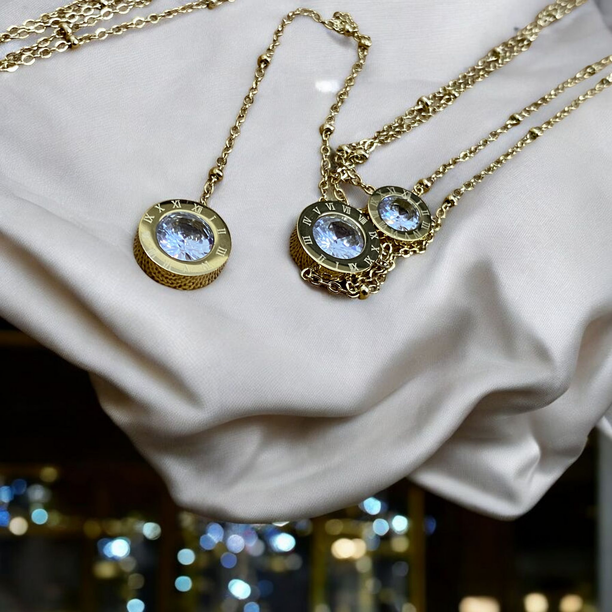 A classic gold pendant featuring a brilliant crystal centerpiece encircled by engraved Roman numerals. Its timeless design blends luxury and simplicity, making it a perfect everyday piece or an elegant gift.