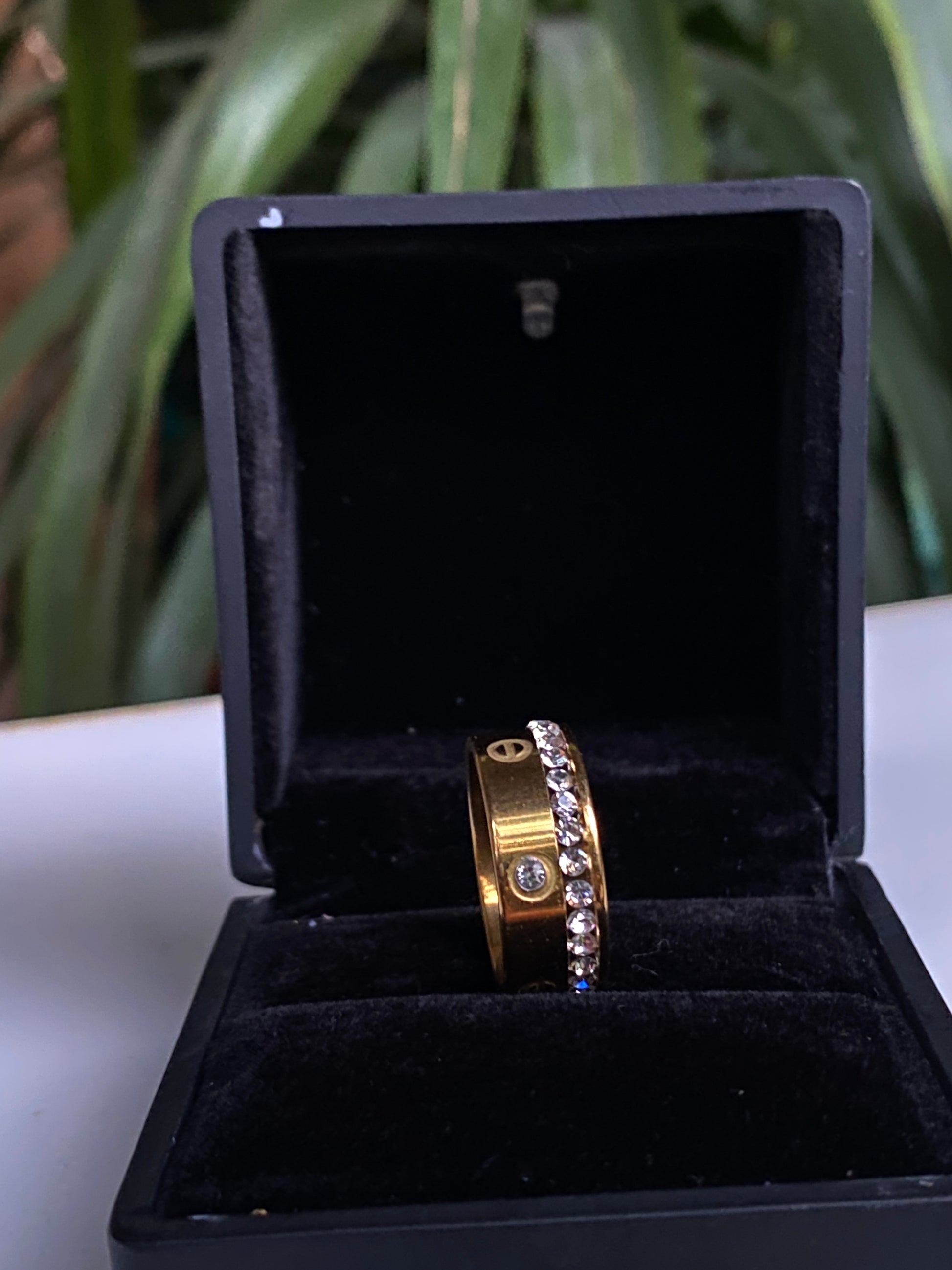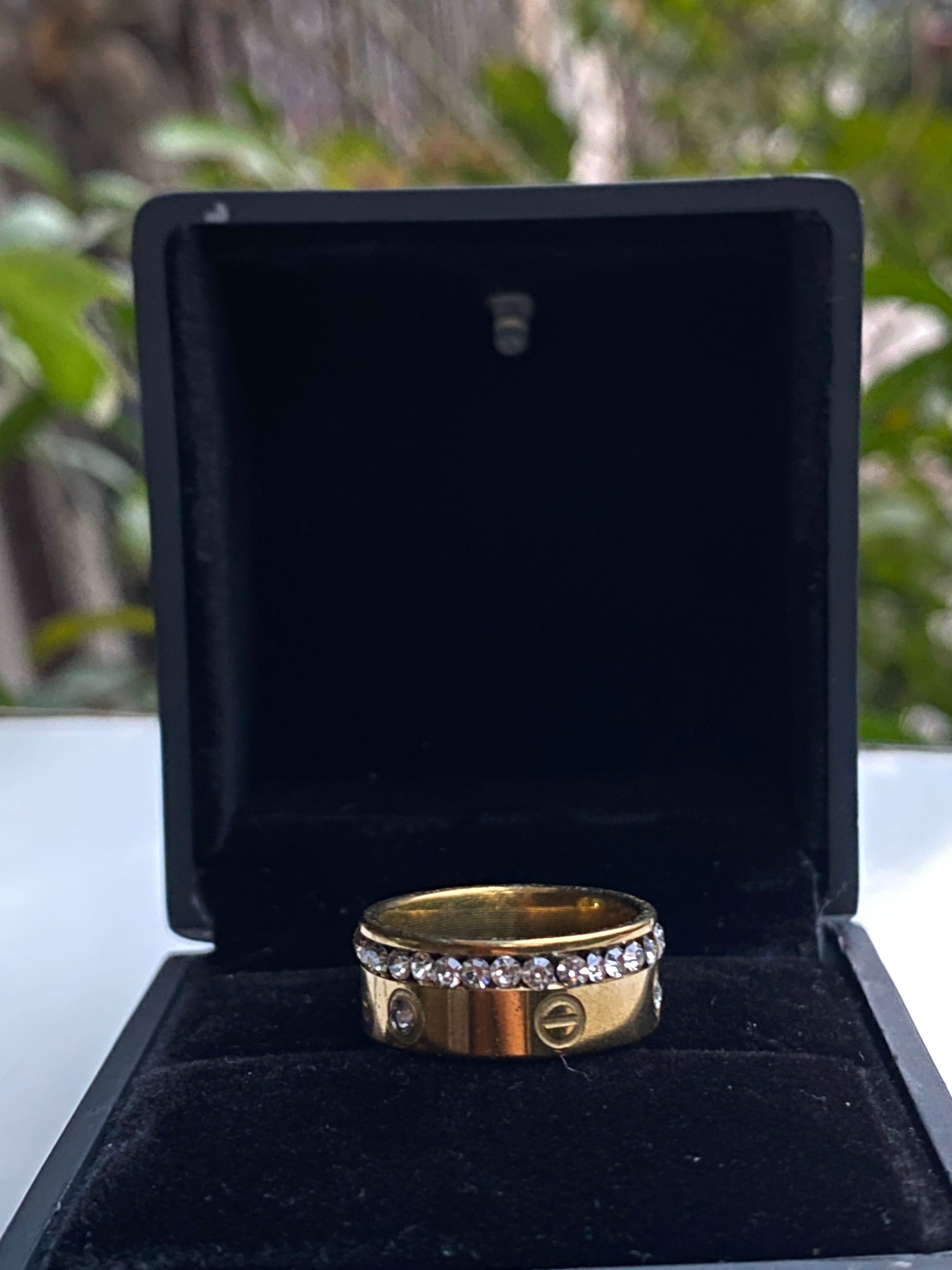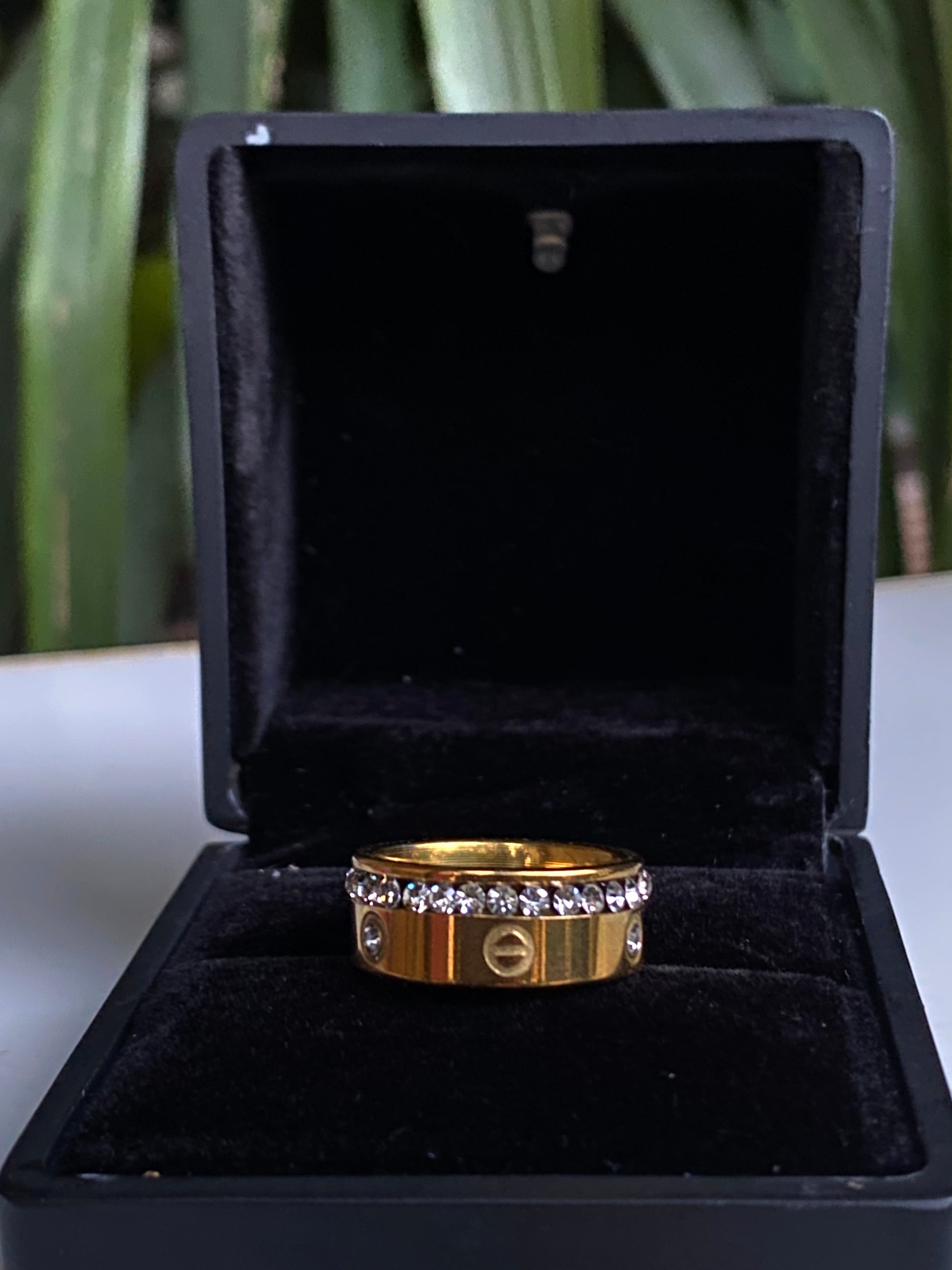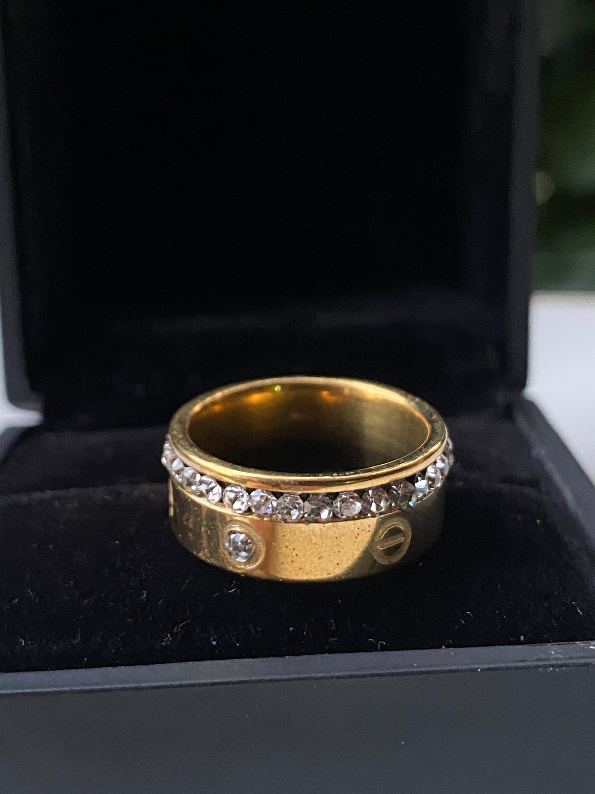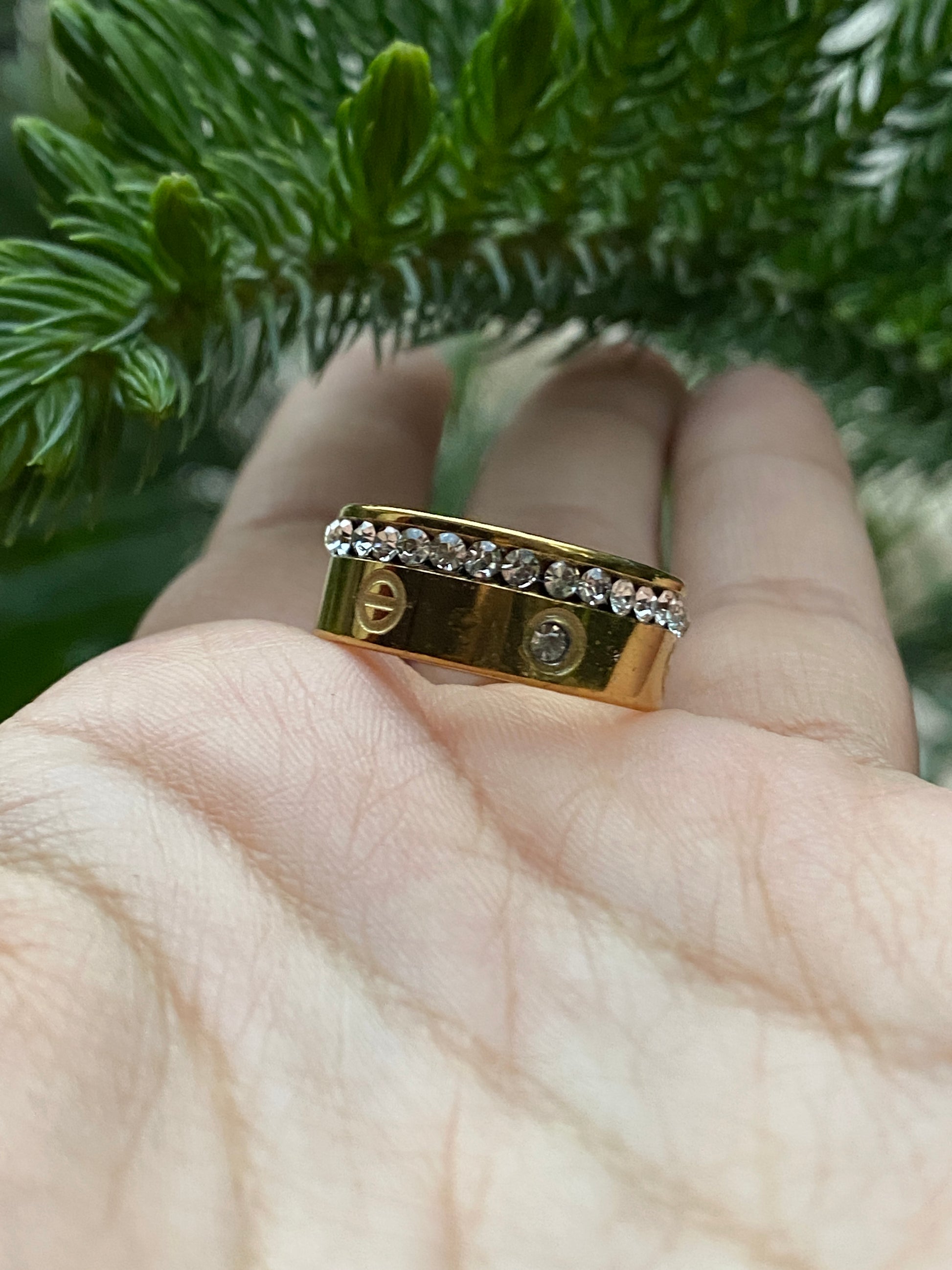 Bold, clean, and straight-up iconic. This band-style ring features a sleek gold finish accented with a row of clear crystals and signature screw detailing for a modern, luxury-inspired look. It’s minimal but powerful perfect for everyday wear when you want something that feels premium without being flashy. Strong lines, solid shine, no effort required.