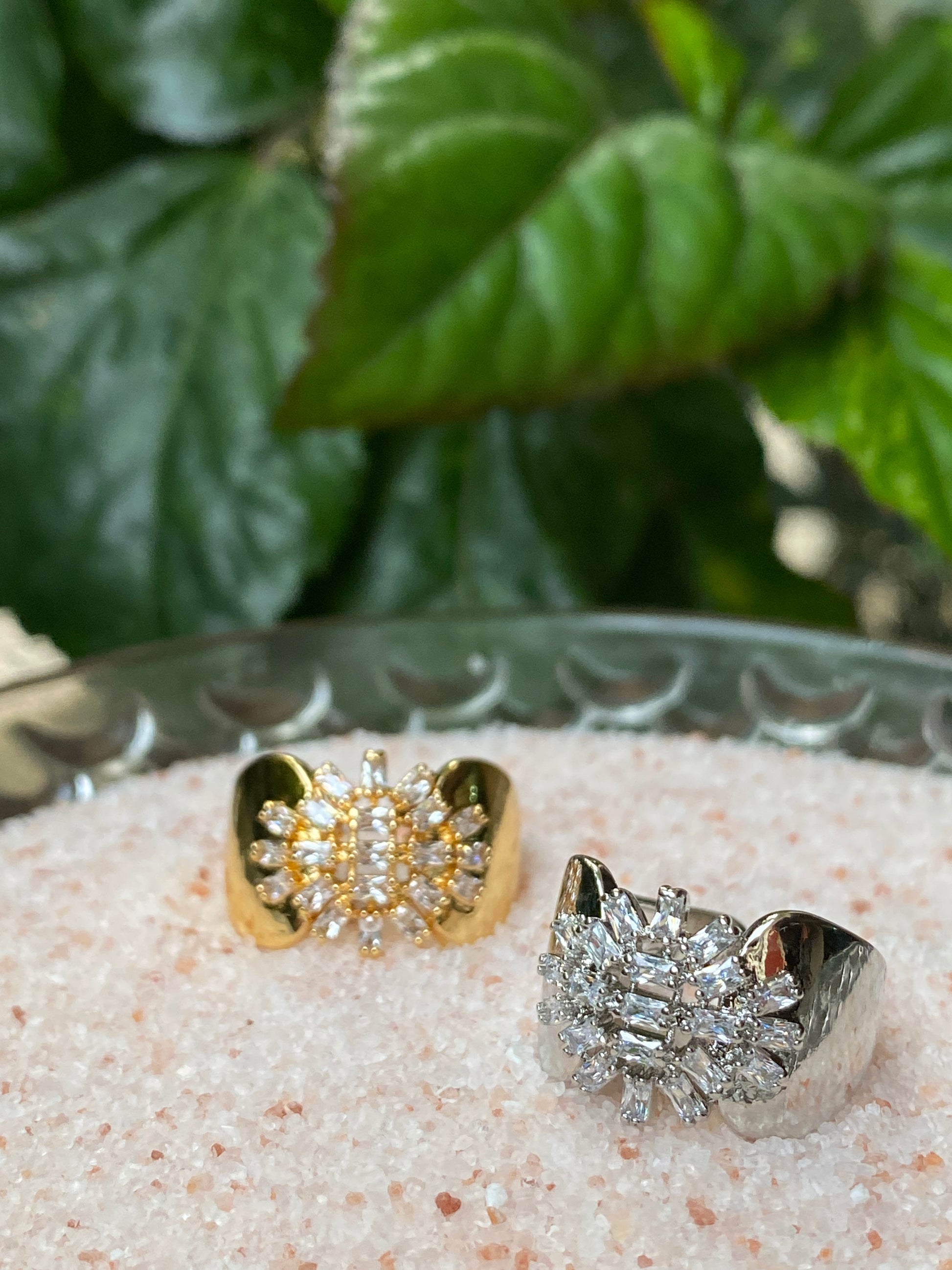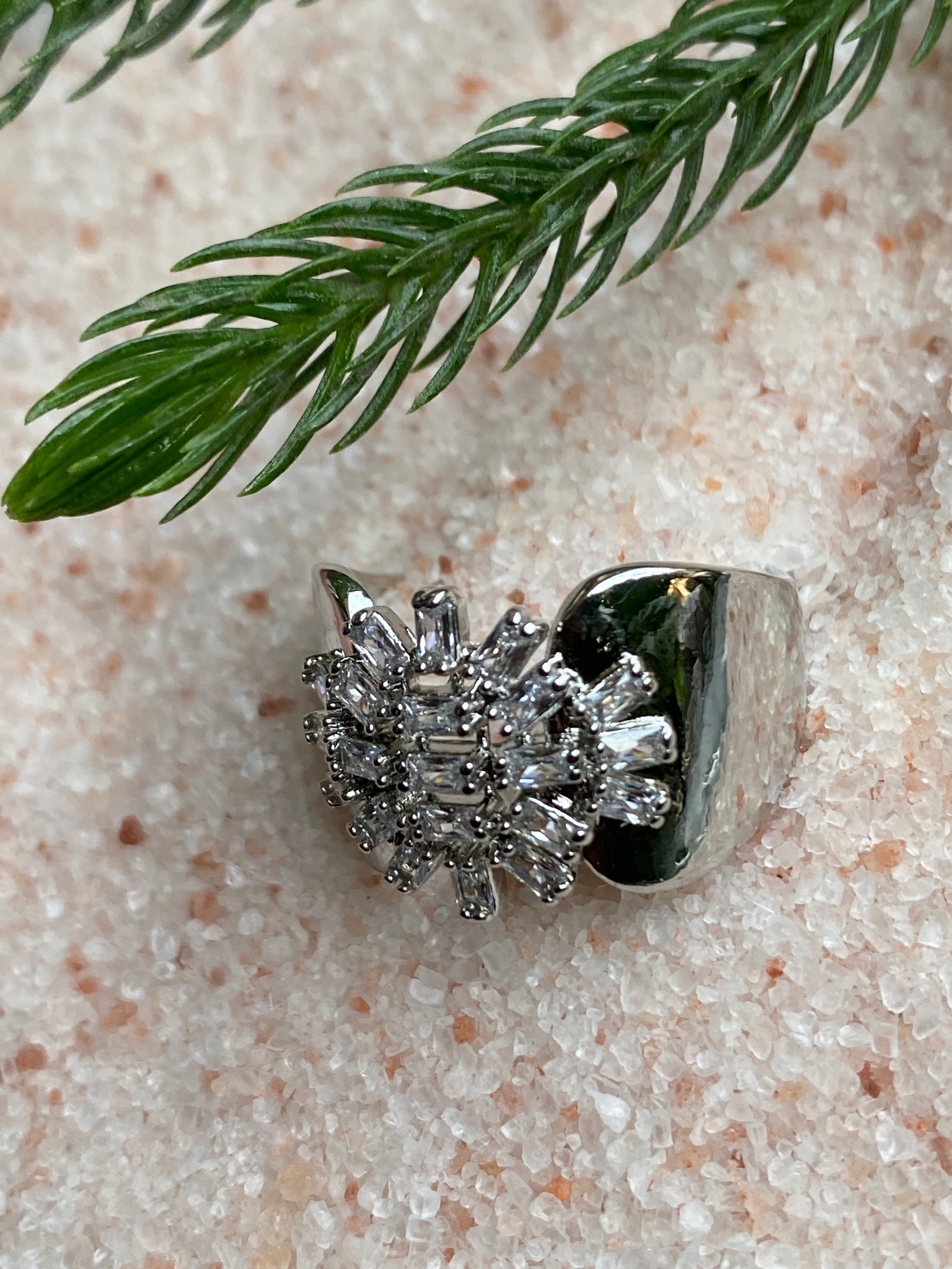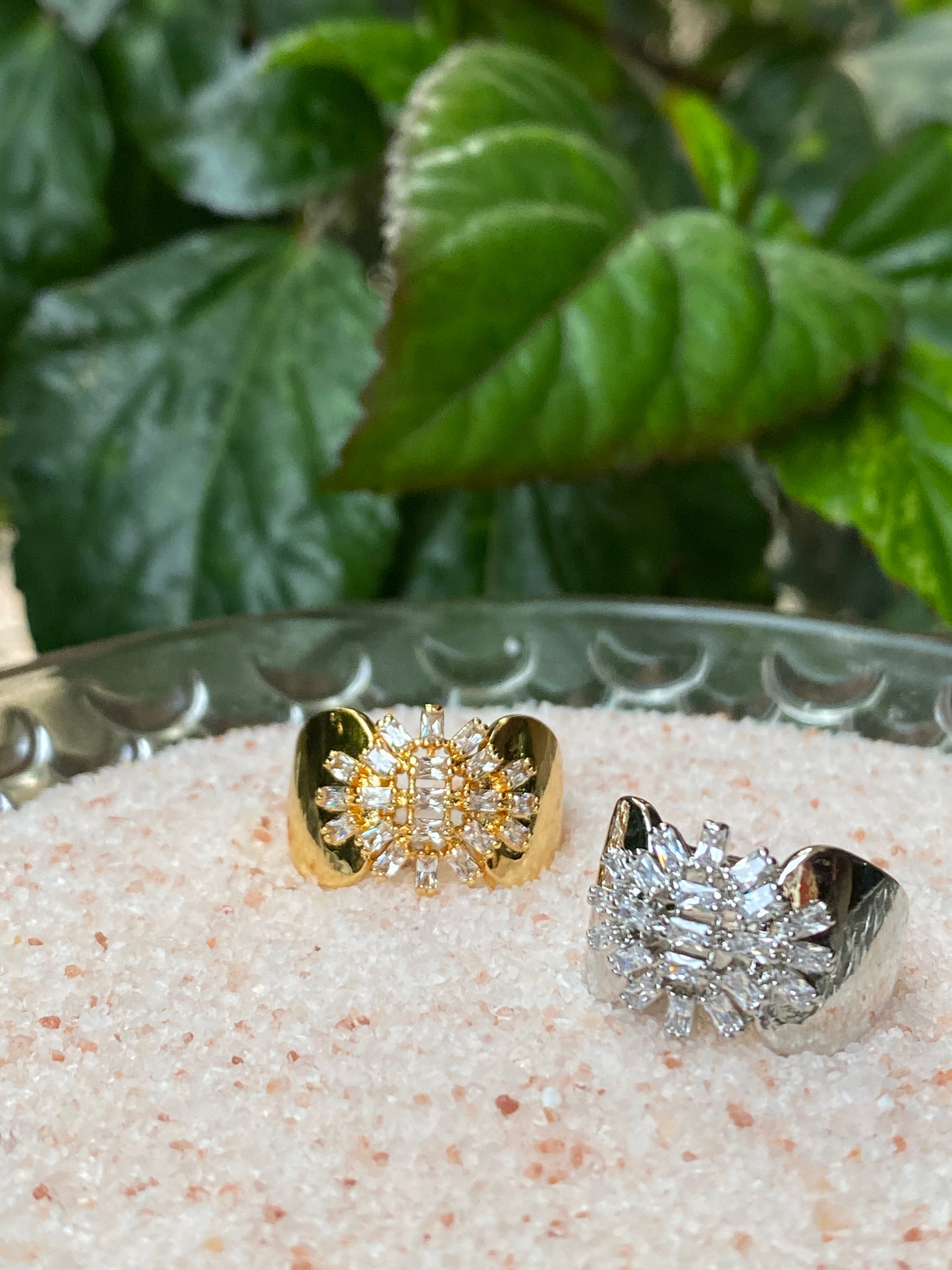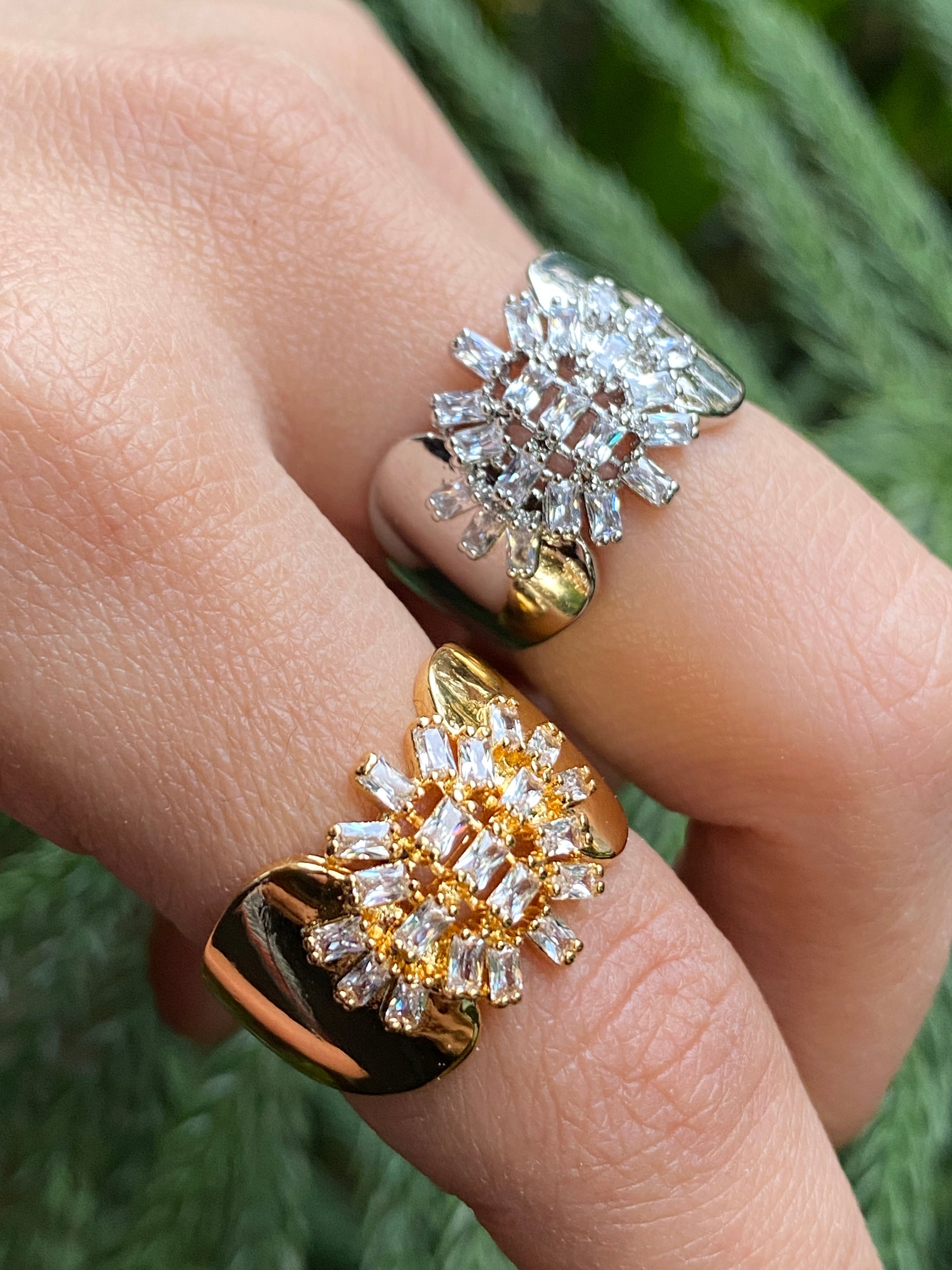 This ring is a straight-up showstopper. Featuring a bold sunburst cluster of baguette-cut crystals framed by a sleek open cuff, it blends vintage glamour with modern edge. The contrast between the high-shine metal and sharp crystal geometry gives it a powerful, editorial look. It’s not subtle and that’s the point. Perfect when you want your jewelry to do the talking.