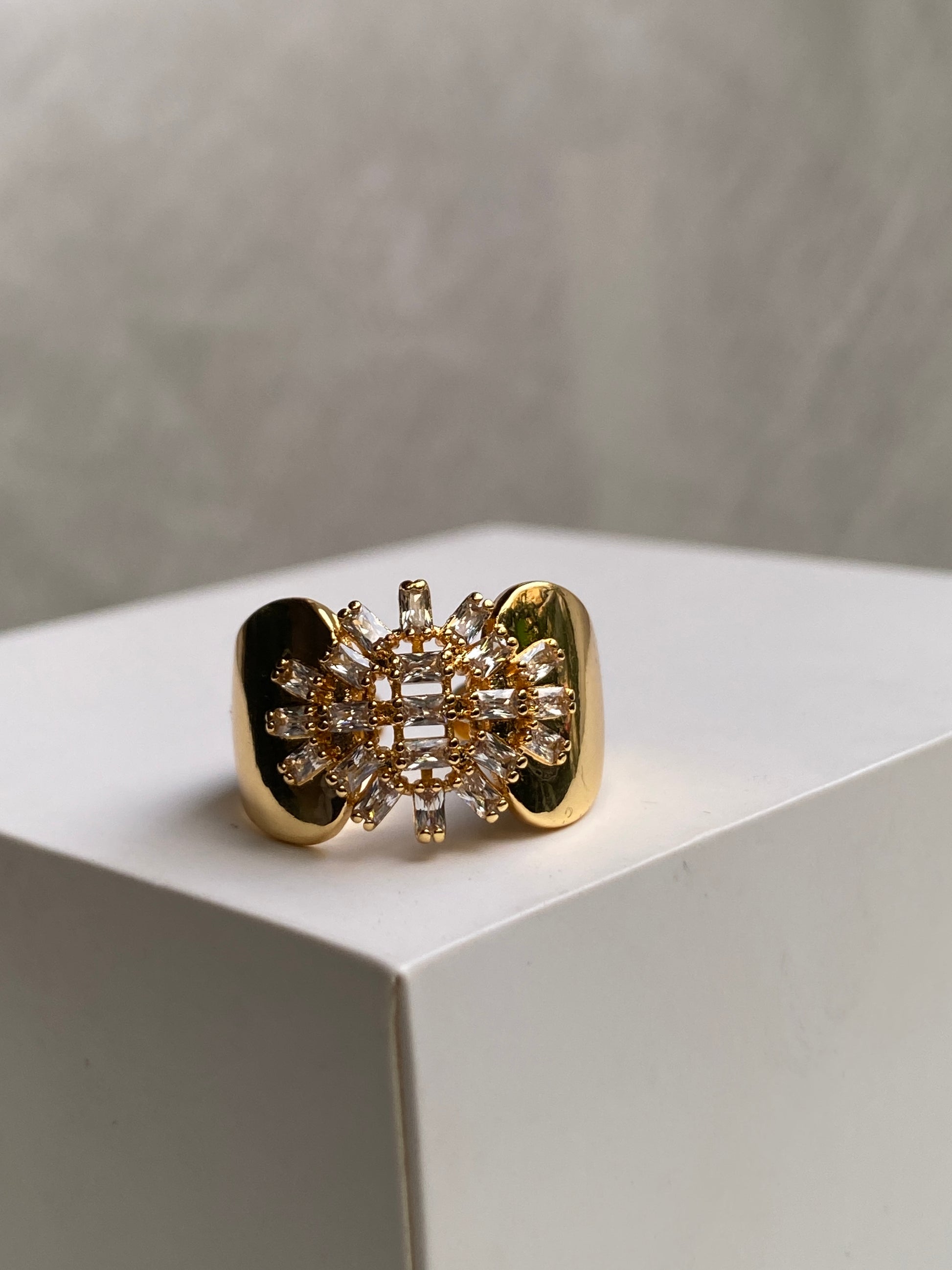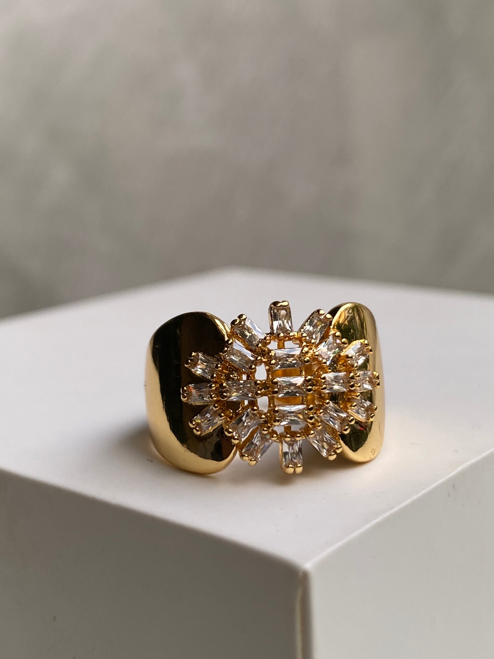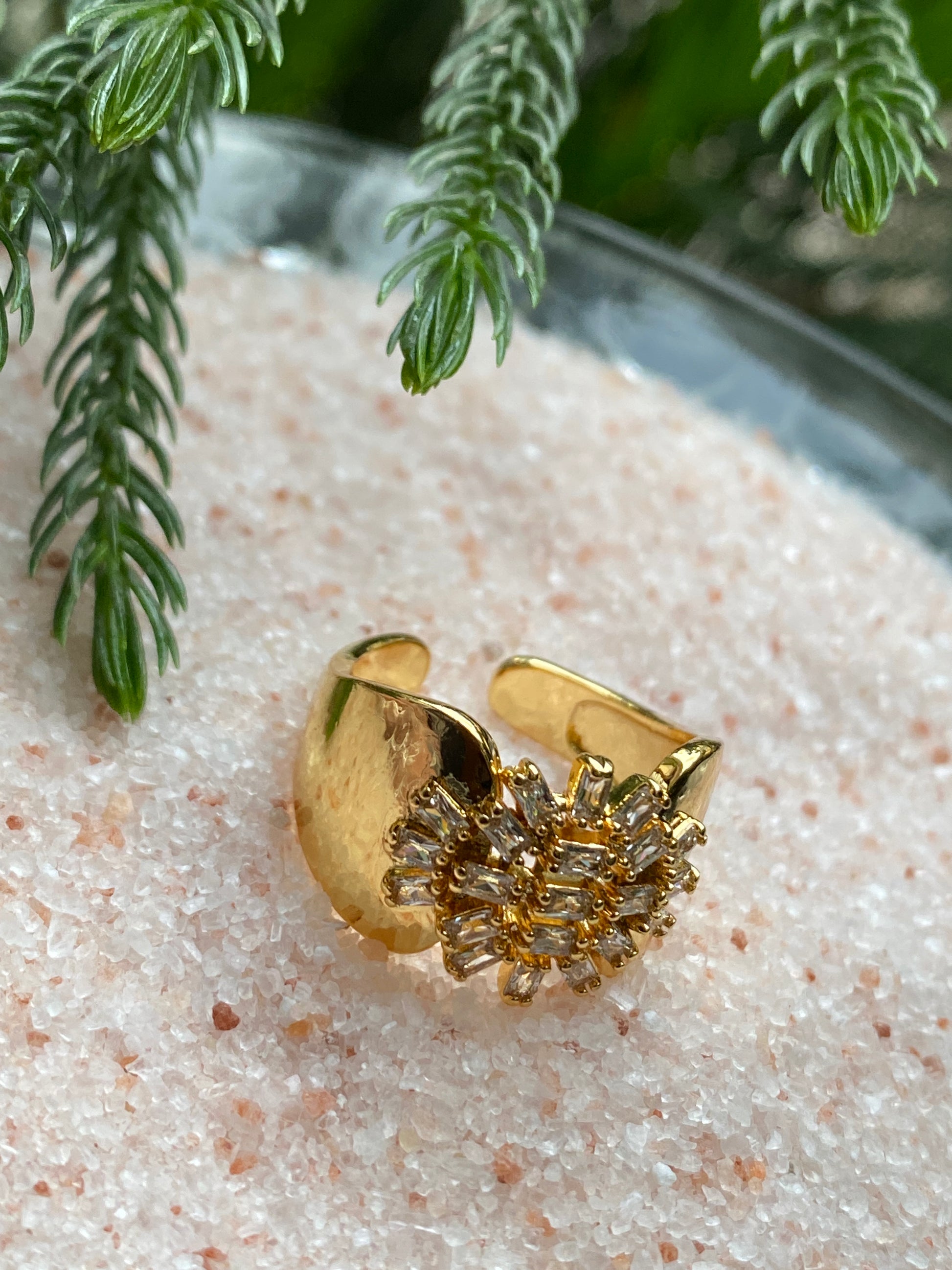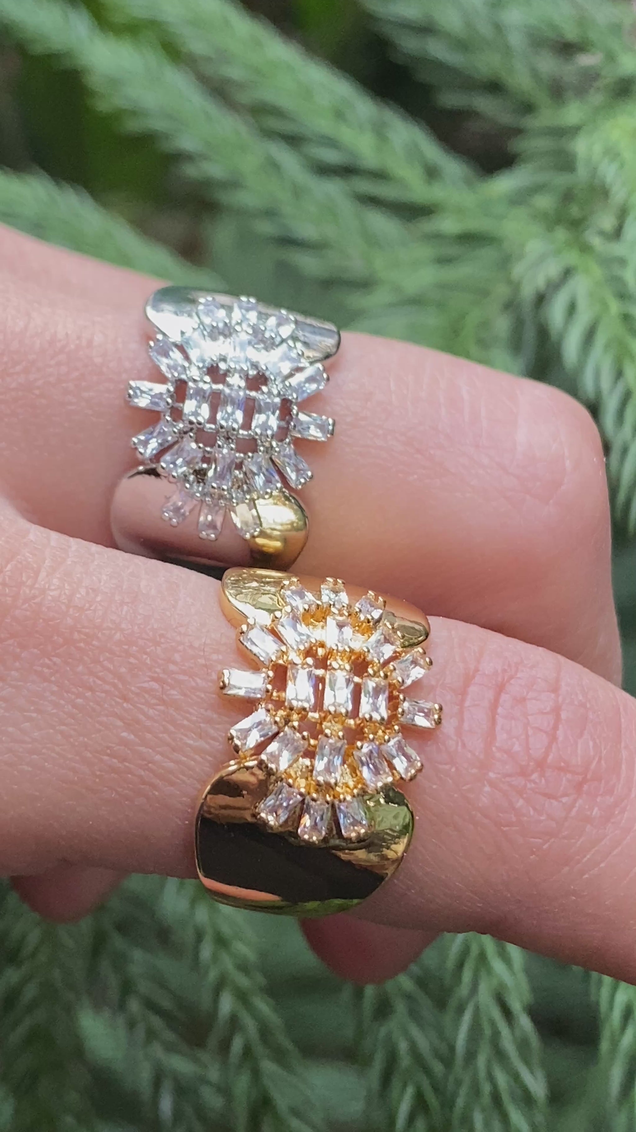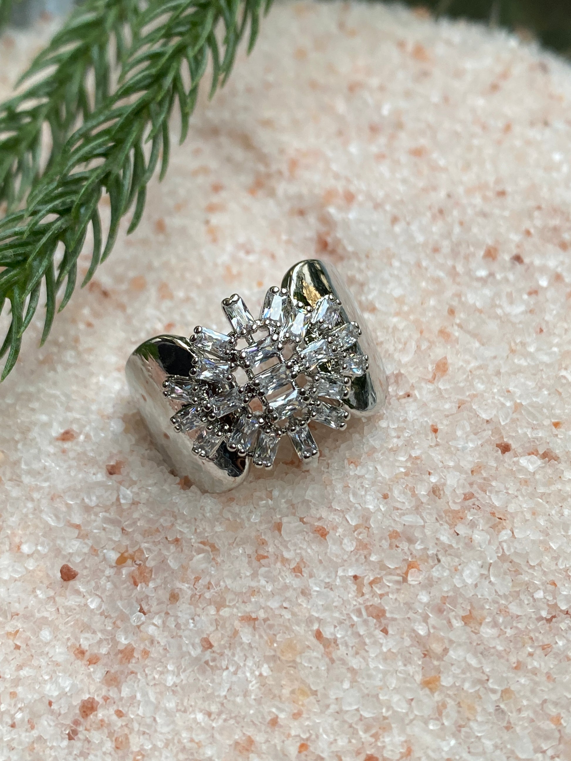 This ring is a straight-up showstopper. Featuring a bold sunburst cluster of baguette-cut crystals framed by a sleek open cuff, it blends vintage glamour with modern edge. The contrast between the high-shine metal and sharp crystal geometry gives it a powerful, editorial look. It’s not subtle and that’s the point. Perfect when you want your jewelry to do the talking.