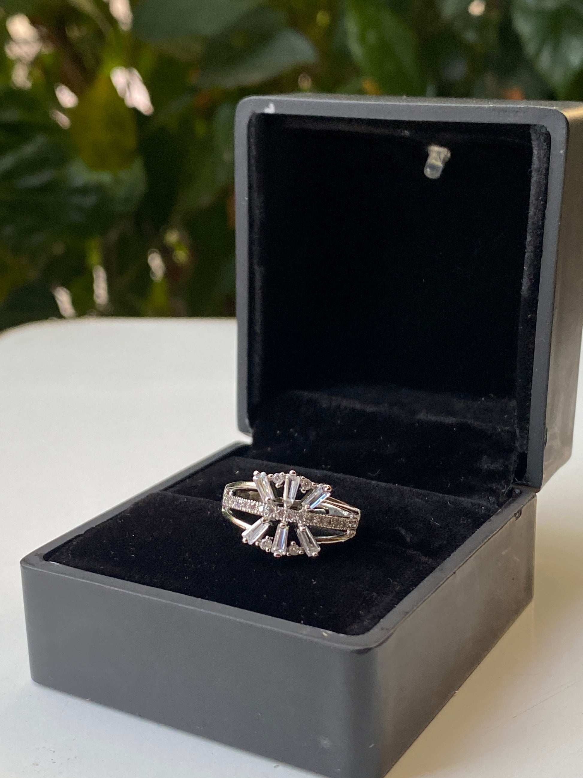 Bold sparkle with a structured edge. This statement ring features a radiant design crafted from fine crystals, set on a sleek split band. The layered geometry creates shine while keeping the look balanced and modern. Eye-catching but refined, it’s made for moments when you want your hands to stand out without going over the top.