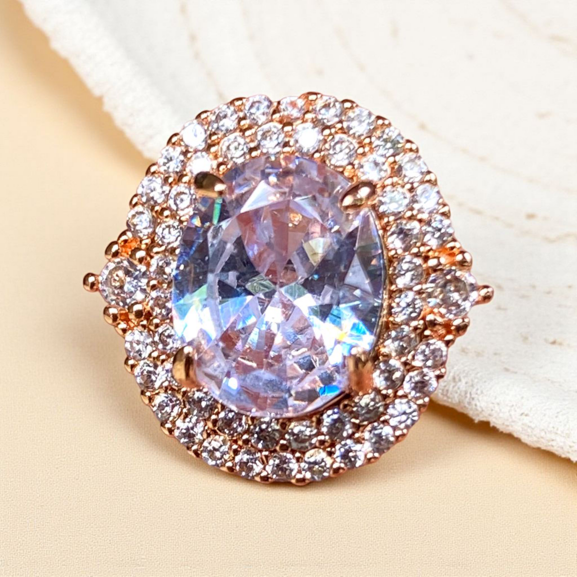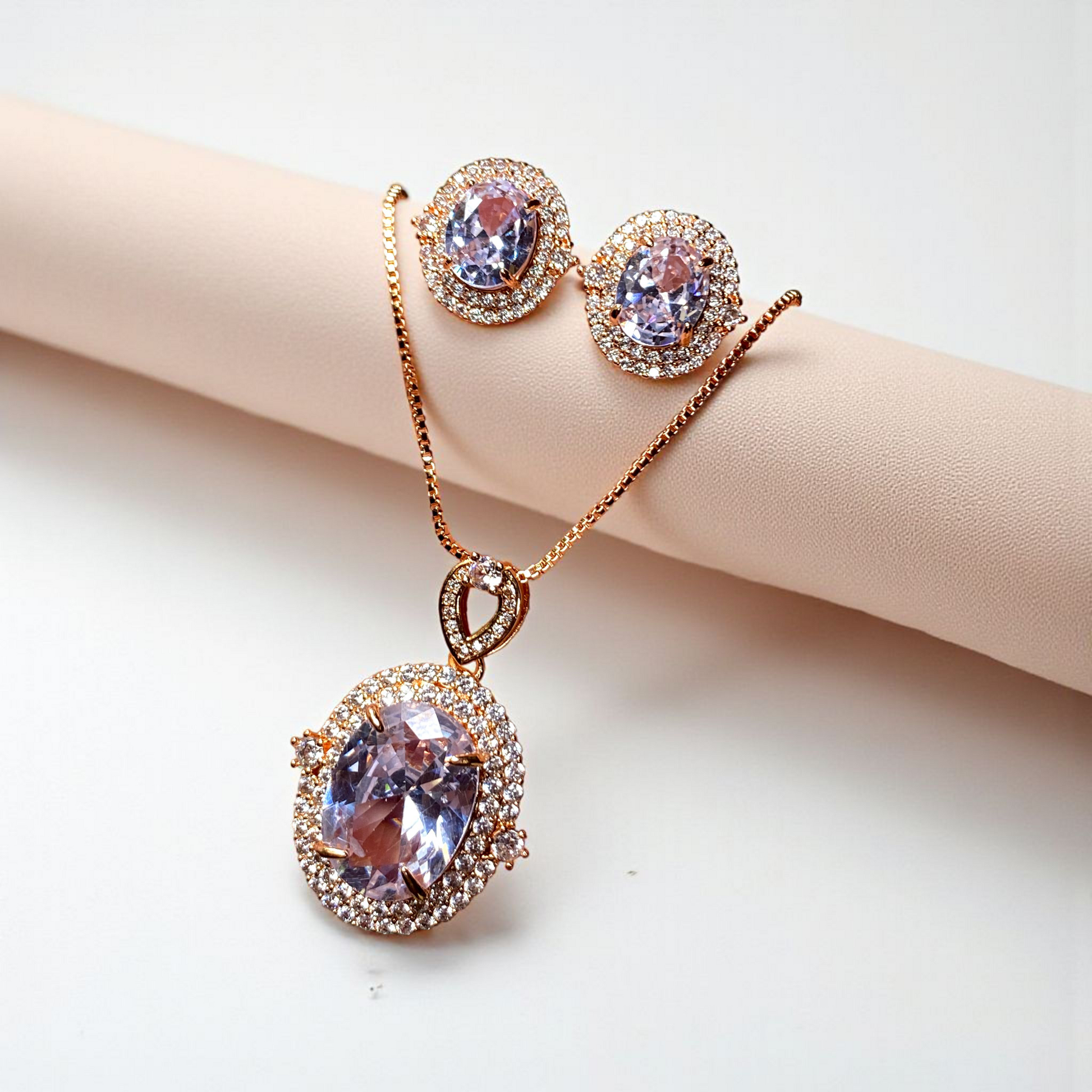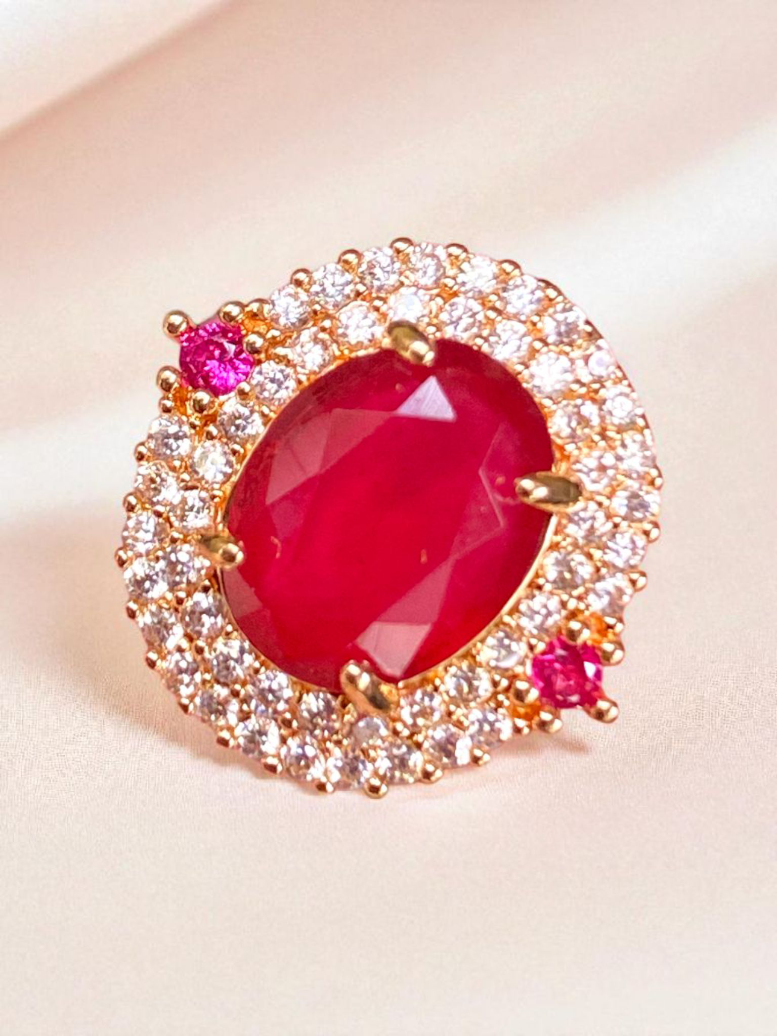 Royal Luxe Oval Set, a regal ensemble designed to exude timeless sophistication. Featuring an elegant oval-cut center stone in a bold ruby. Each piece is framed with dazzling pavé crystals and set in a radiant rose gold finish.