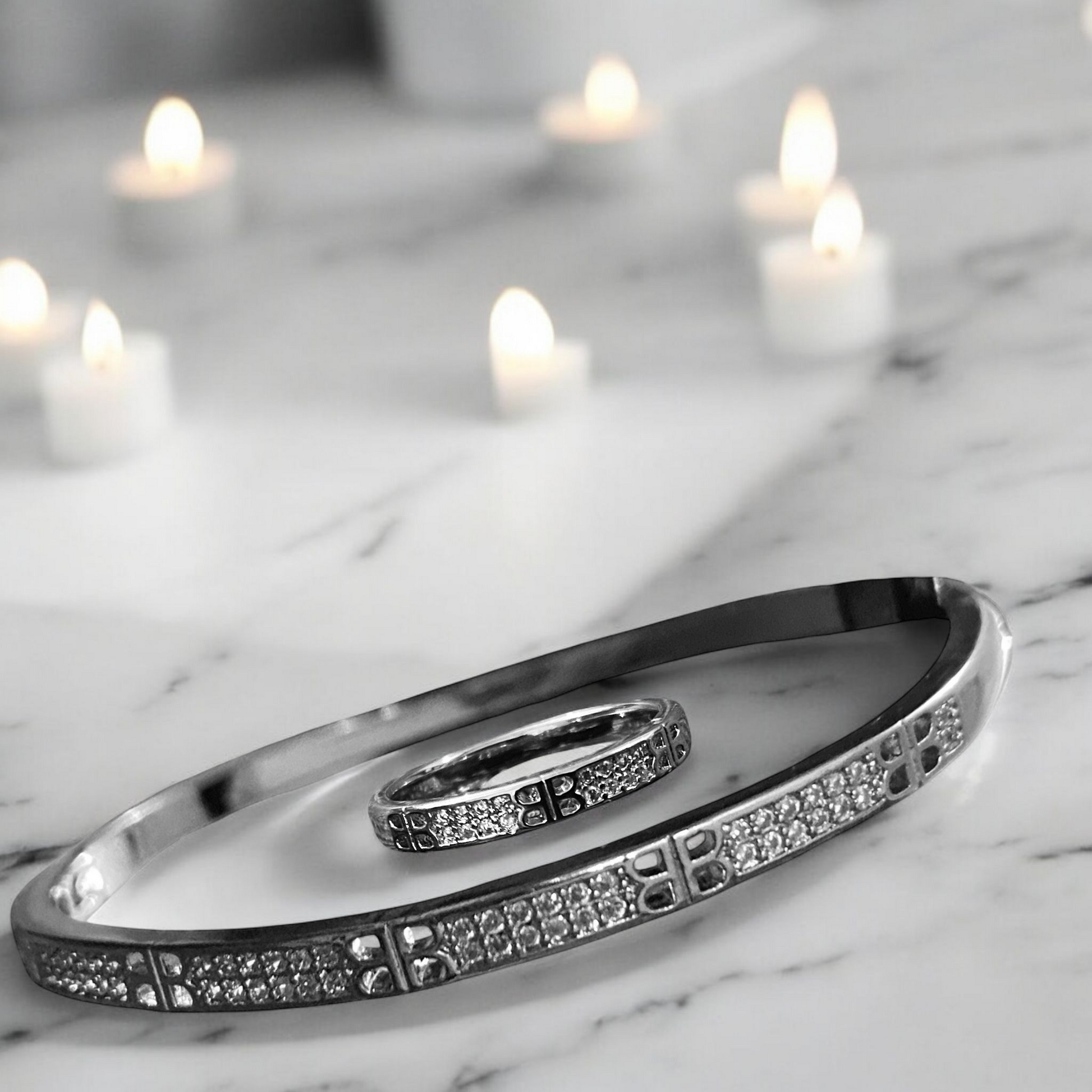 Description: Elegant silver bangle accented with fine crystals for a refined, everyday sparkle, paired with ring.