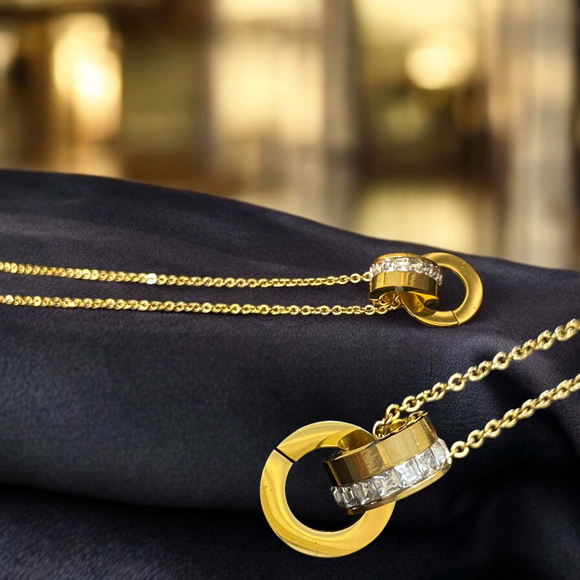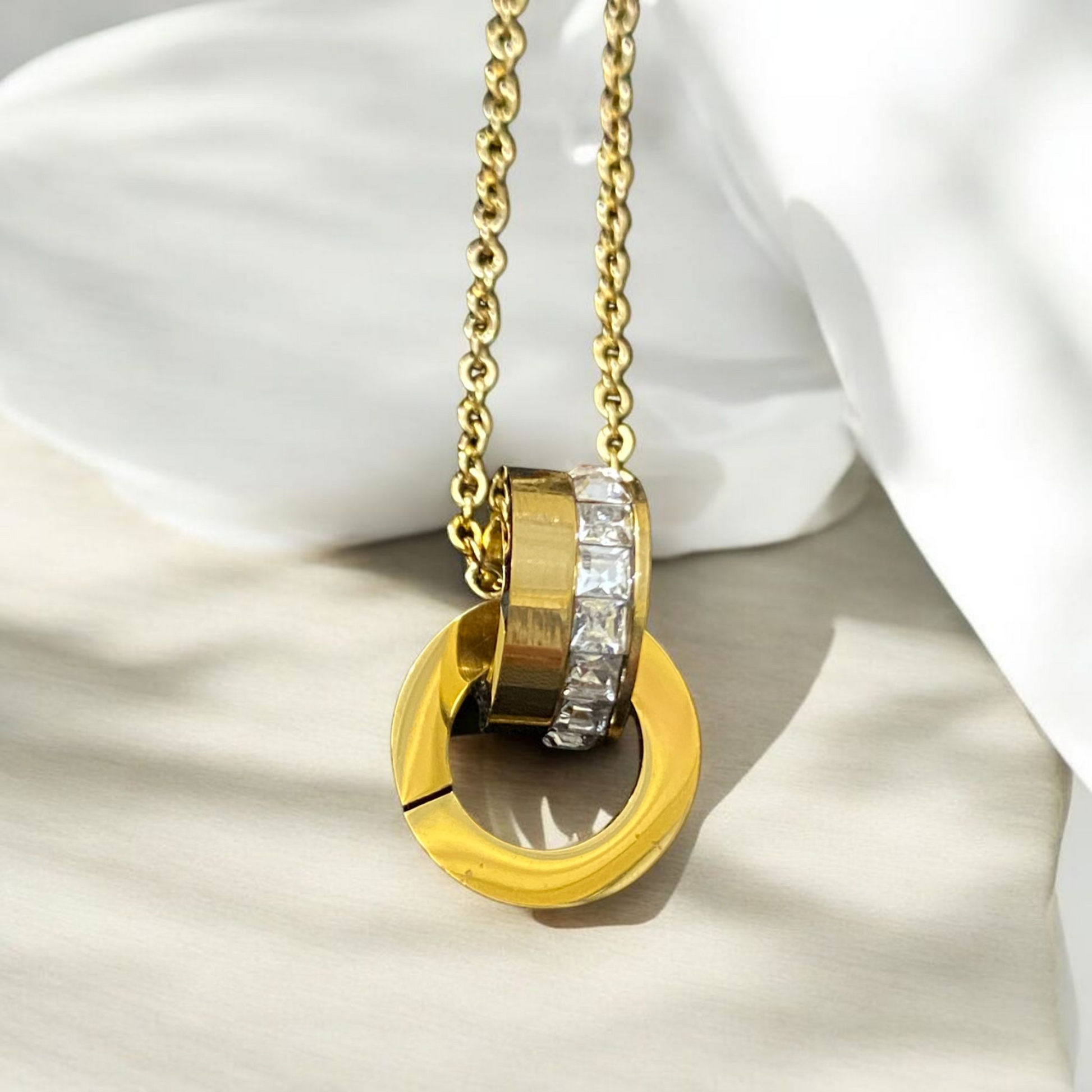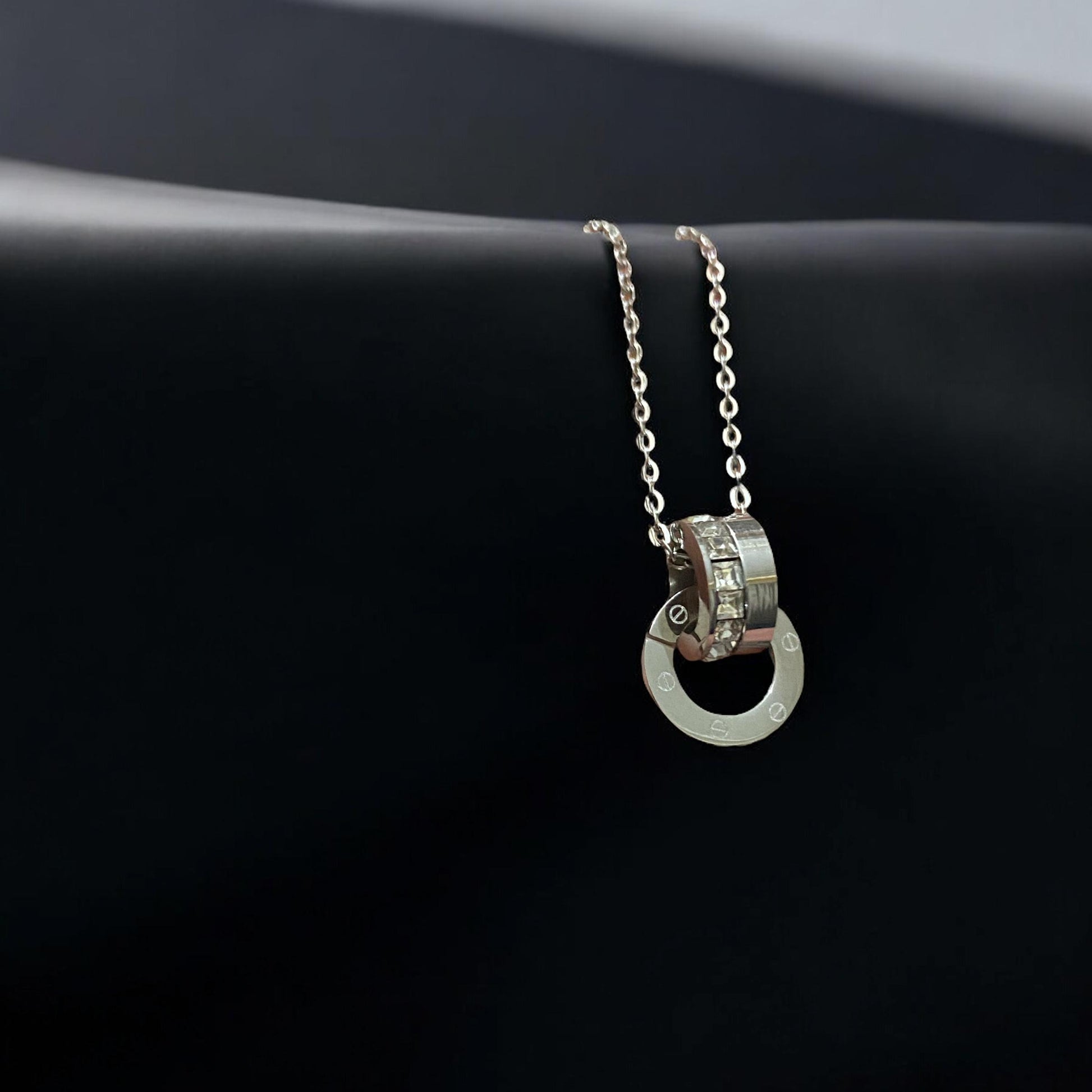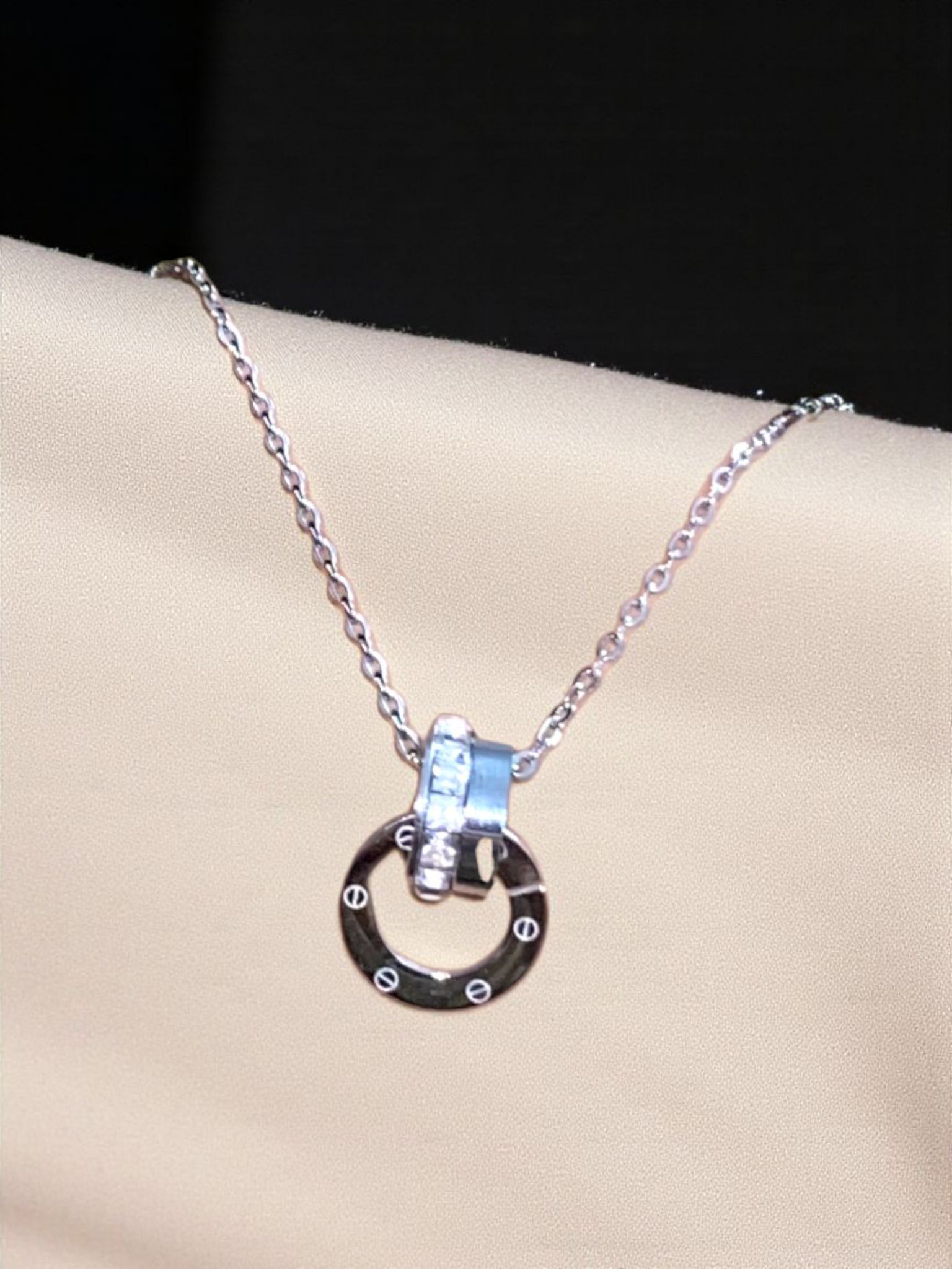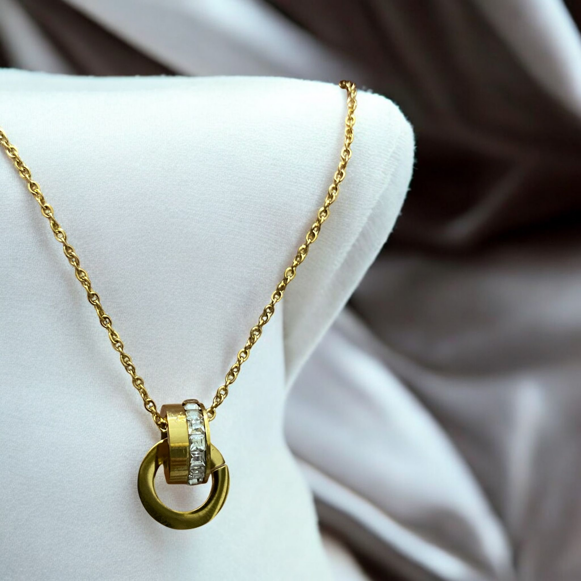 A bold and modern pendant featuring a circular charm with metallic detailing, suspended on a sleek chain. Its minimalist yet powerful design, makes it perfect for both casual and elegant looks. available both in silver and gold colour.