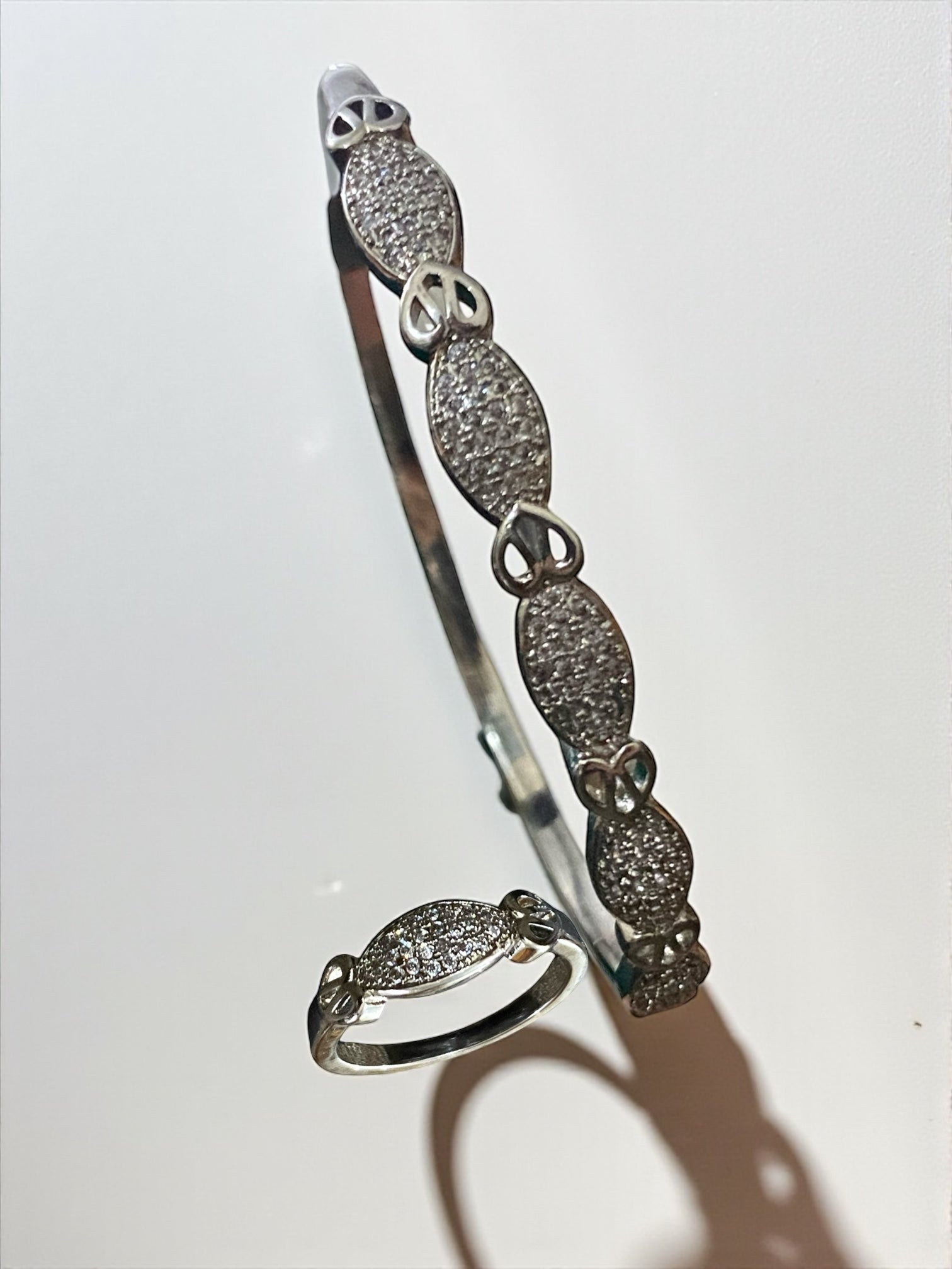 A striking silver bangle designed with geometric crystal patterns that catch the light beautifully. Perfect for adding a modern touch to both casual and evening looks.
