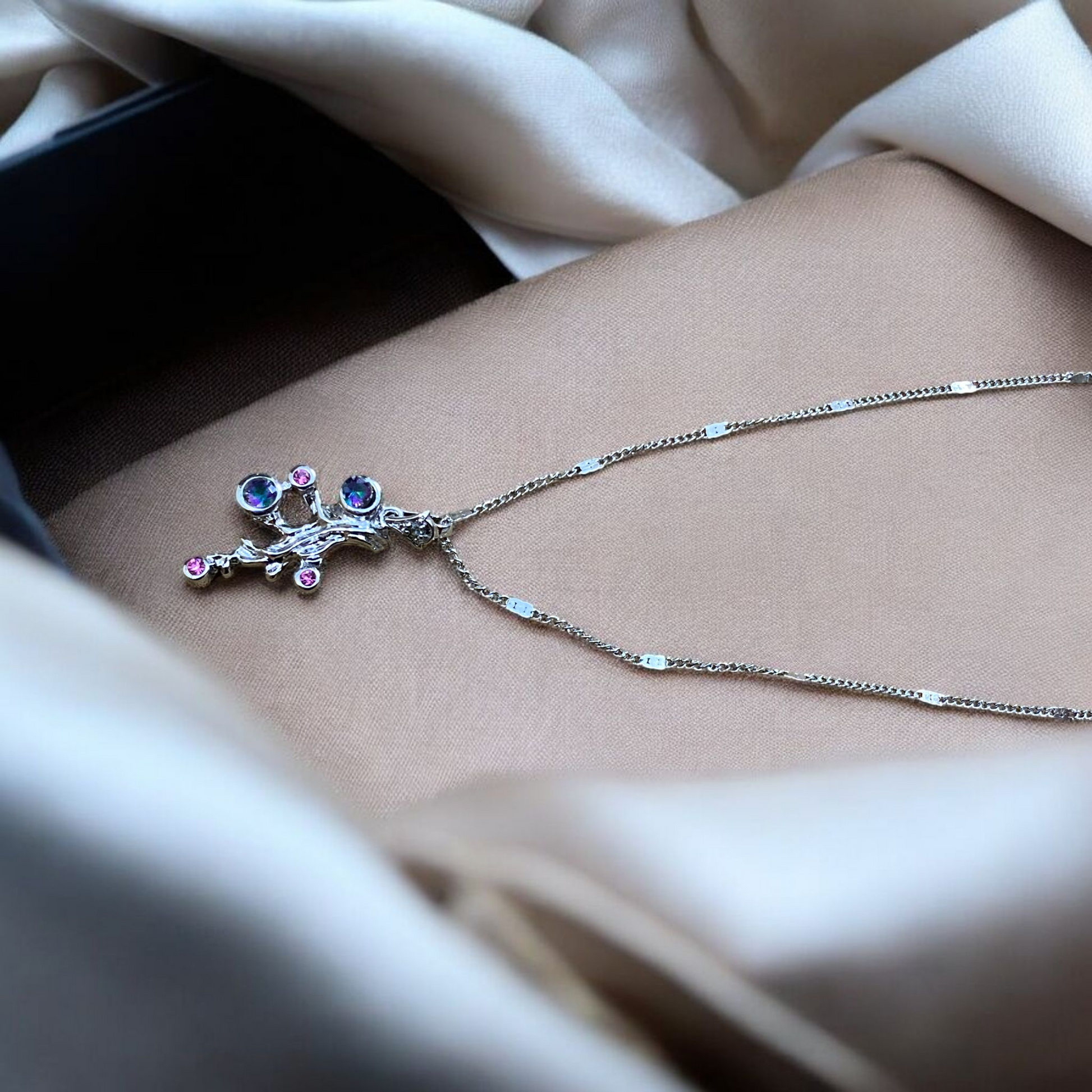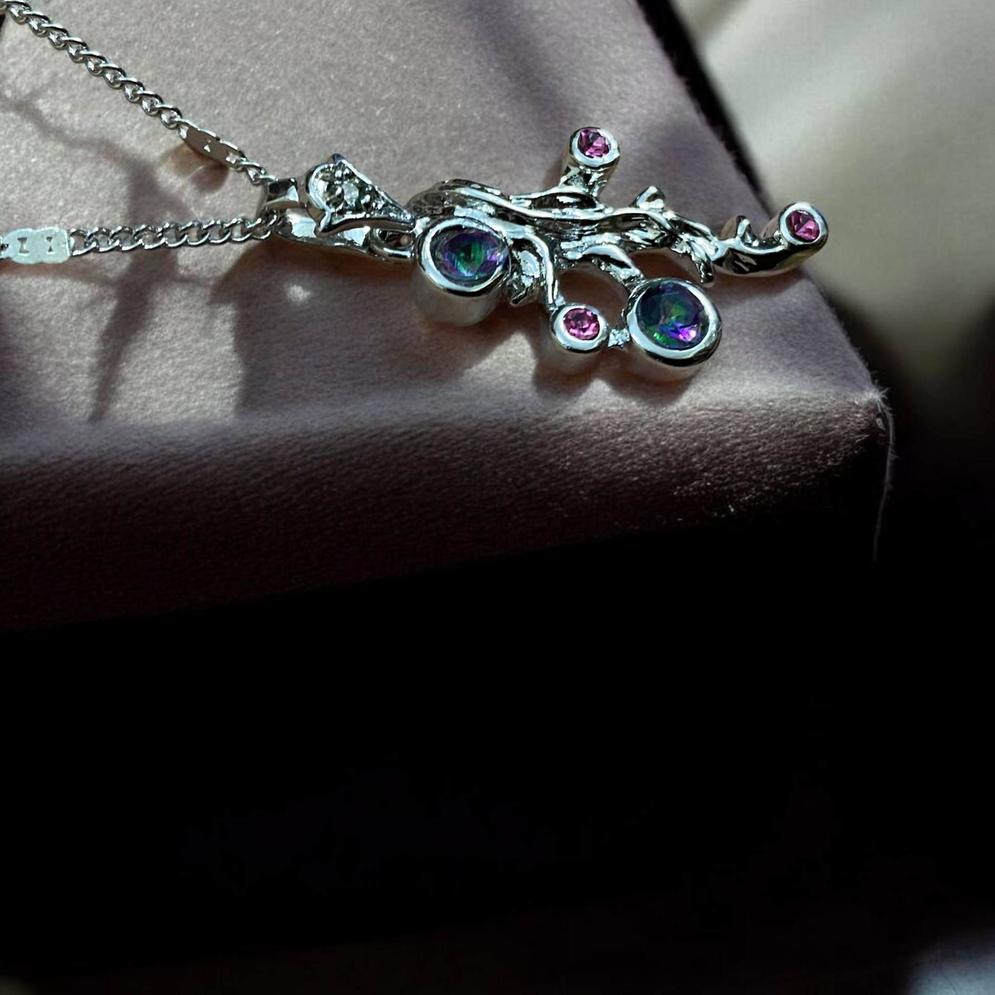 A unique silver pendant inspired by nature, featuring branch-like curves adorned with pink crystals. Its artistic design and radiant colors make it a standout piece for elegant or creative looks.