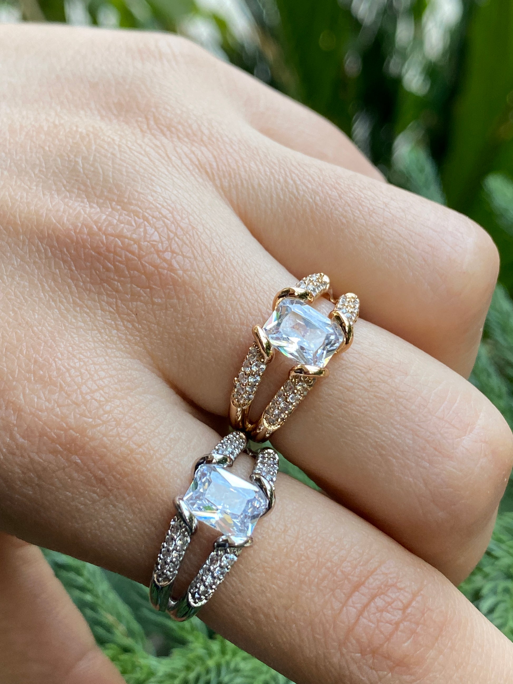 Add a touch of timeless elegance to your everyday and occasion looks with this stunning square-cut sparkle ring. Designed with a radiant center stone and delicately pave-set bands, this ring offers a perfect balance of luxury and modern sophistication. Available in gold-tone and silver-tone, it’s crafted to shine beautifully from every angle.